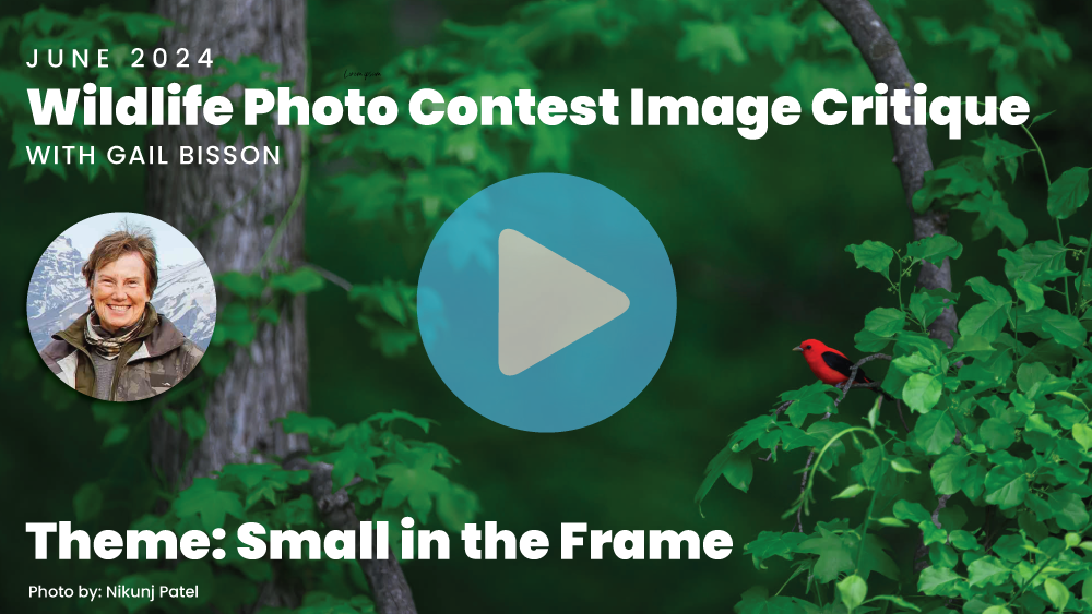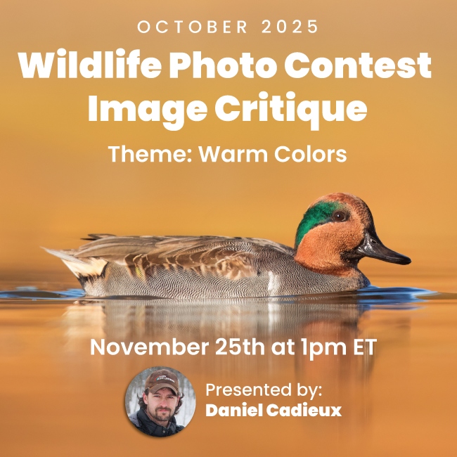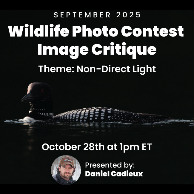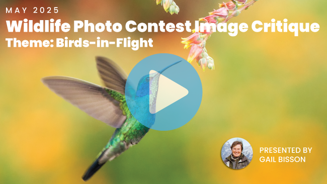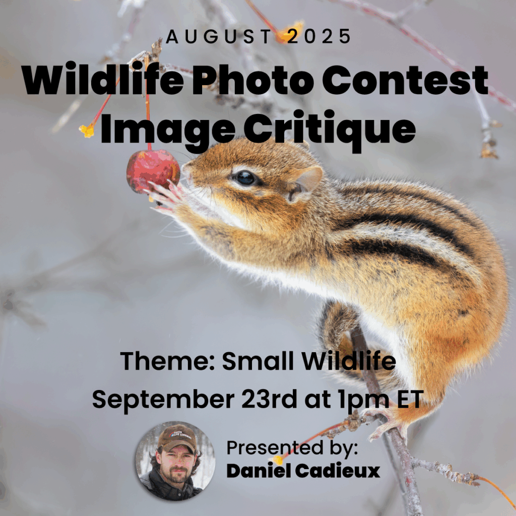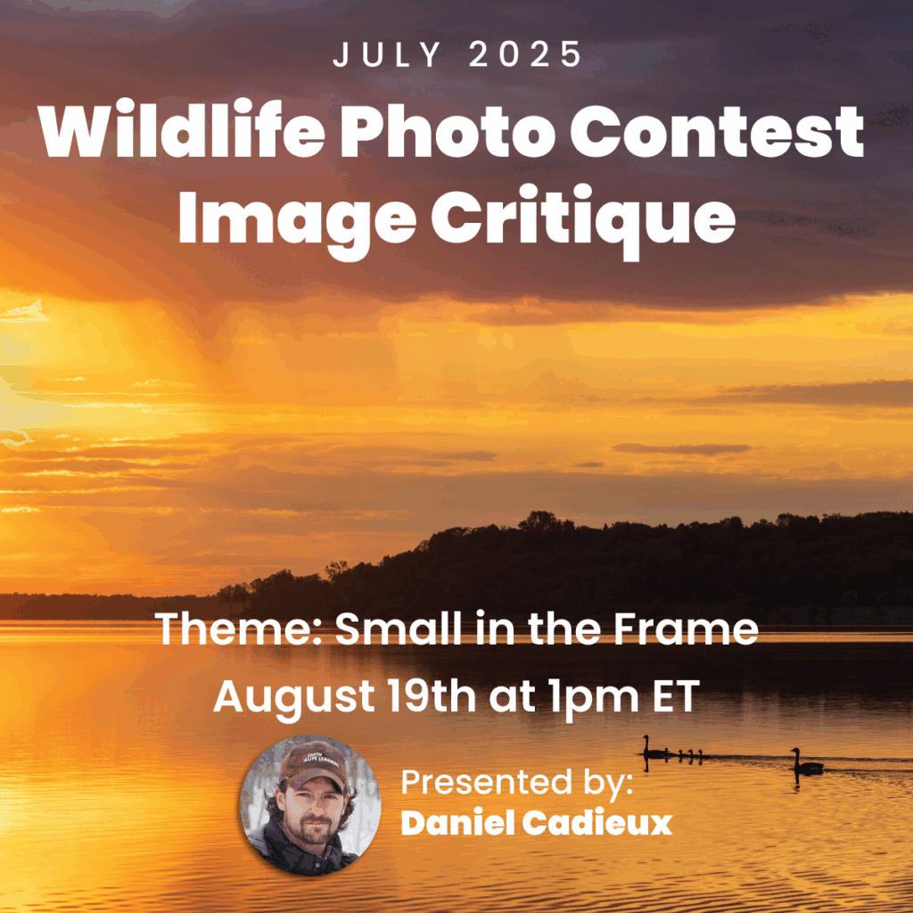 The August 2025 contest challenged members to feature wildlife 12 inches or smaller—highlighting scale, space, and subtle storytelling. The live critique explored how angle, light, and clean backgrounds can elevate even the smallest subjects.